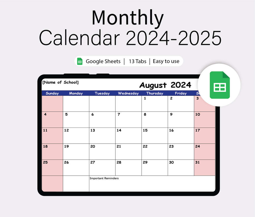 Digital Monthly Calendar 2024 2025 Teacher Planner Editable Google Sheets