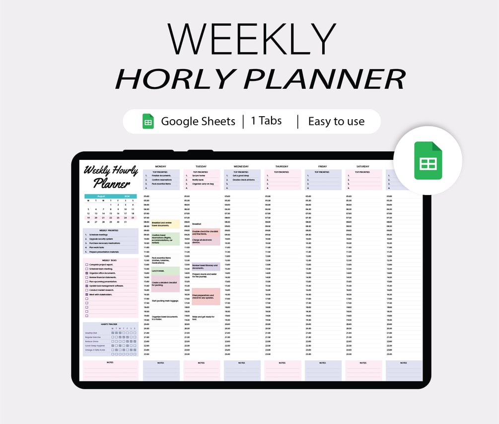 Editable Hourly Weekly Schedule,Google Sheets, weekly schedule template editable